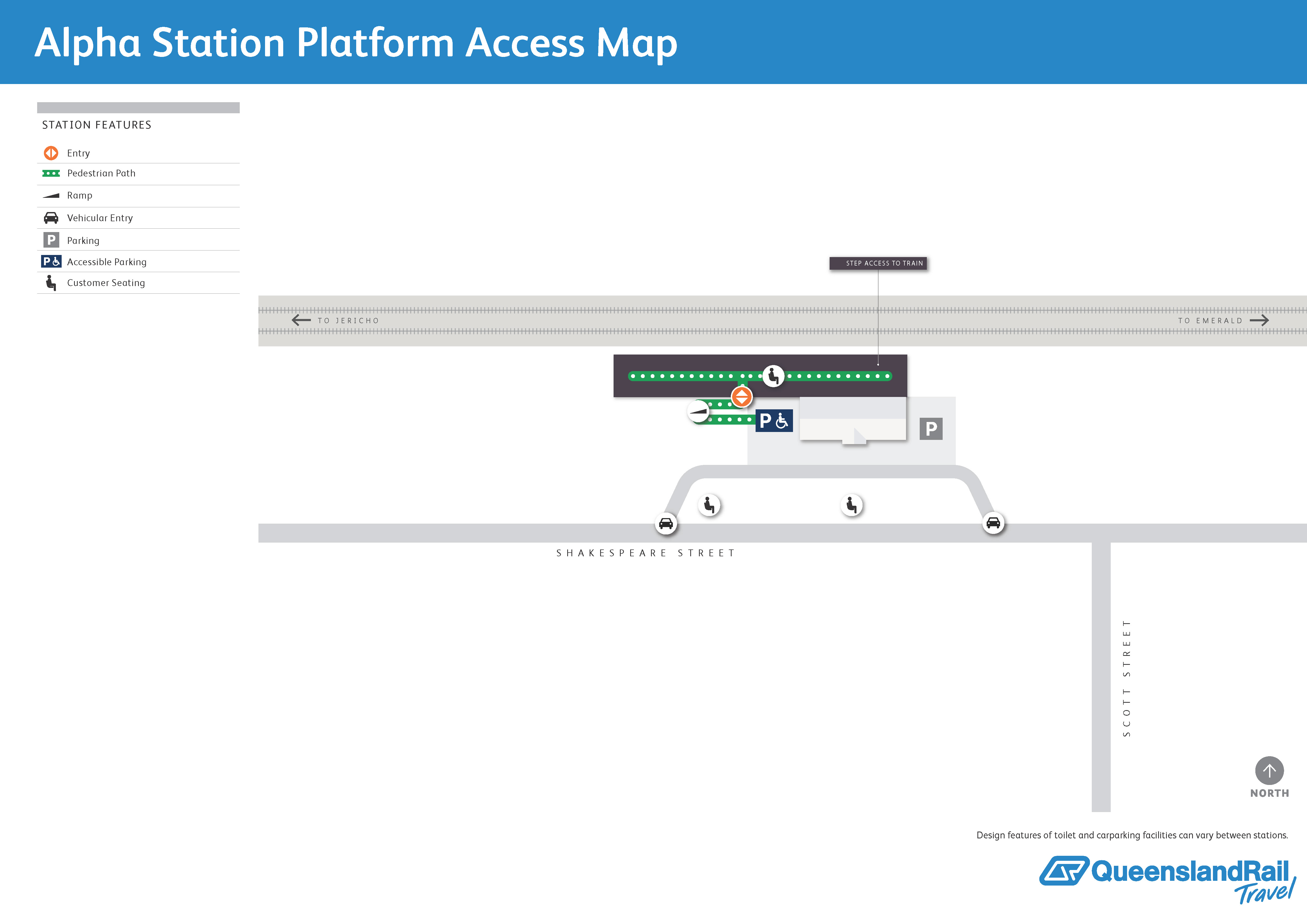 Alpha railway station is accessed from Shakespeare Street, via a gravel driveway. It services passenger trains travelling westbound to Longreach, and eastbound to Rockhampton then down to Brisbane. There is one platform, which is on the southern side of the track. Access to the platform is via a ramp. There is carparking available, including an accessible space.