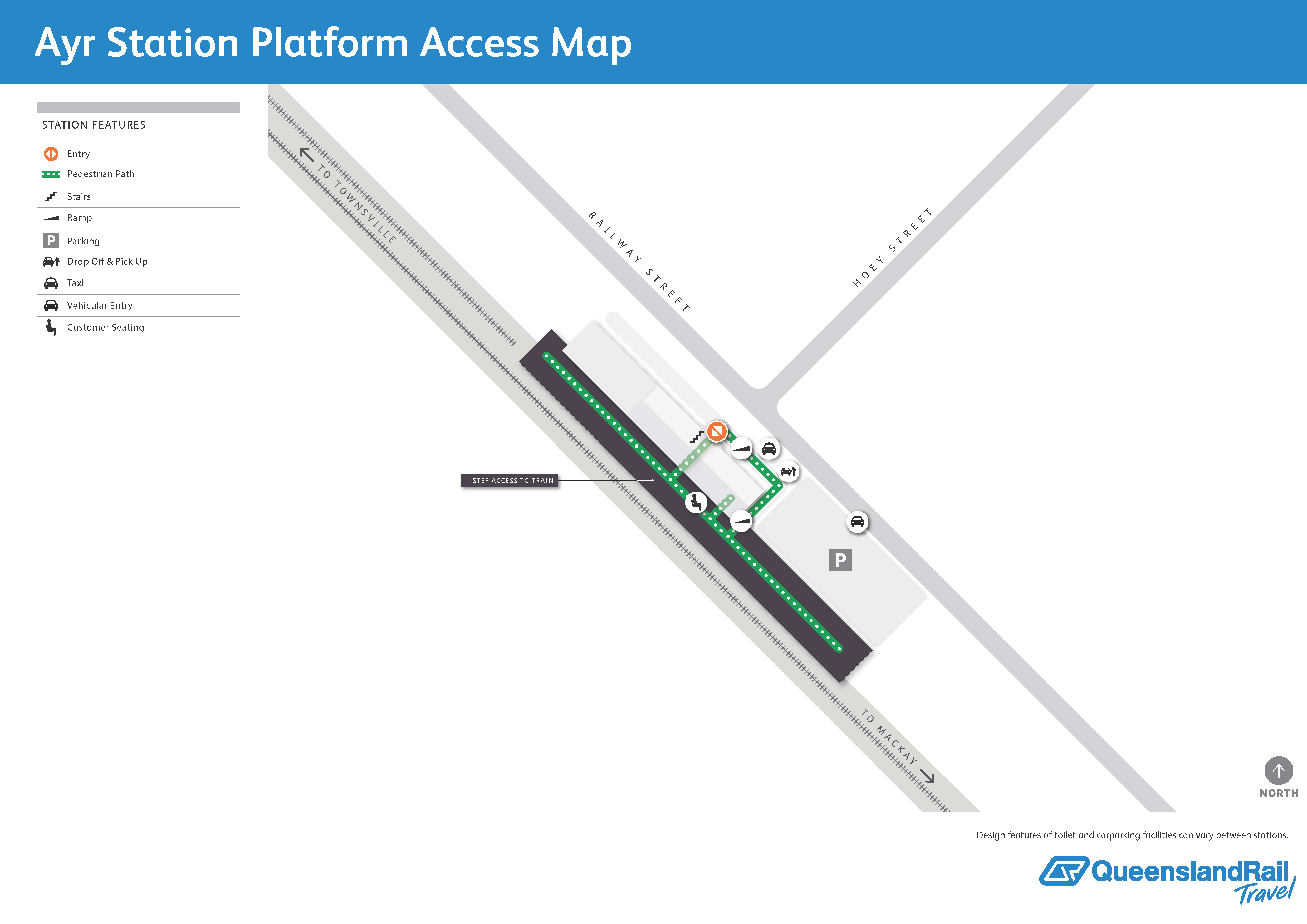 Ayr railway station is located on Railway Street. It services passenger trains travelling northbound to Cairns and southbound to Brisbane. There is one platform, which is on the northeastern side of the track. There is carparking available at the station. Access to the platform is via a flat path.