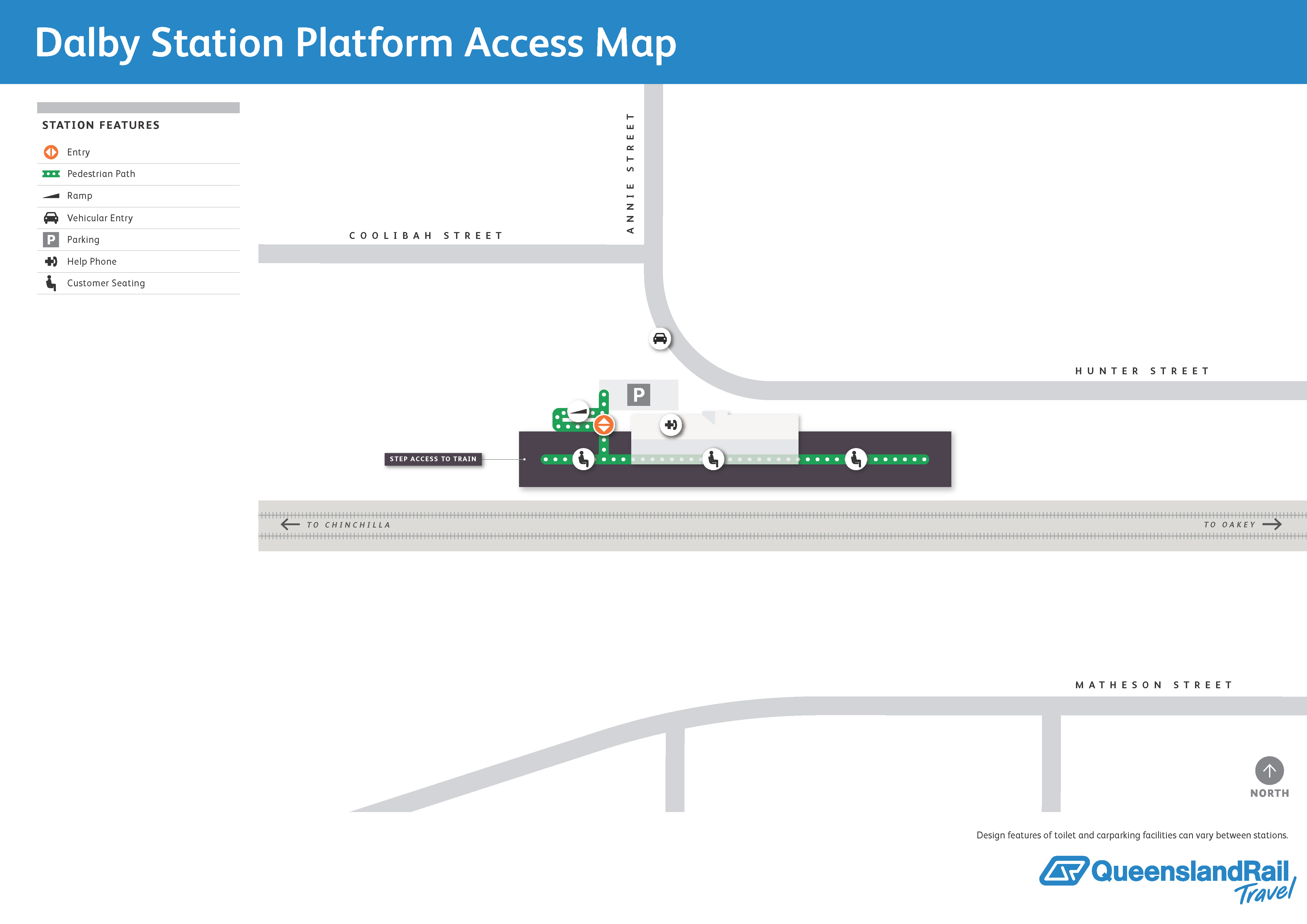 Dalby railway station is located on Hunter Street. It services passenger trains travelling between Charleville in the west to Brisbane (Roma Street station) in the east. There is one platform, which is on the northern side of the track. Access to the platform is via a ramp or steps. There is parking available at the front of the station.