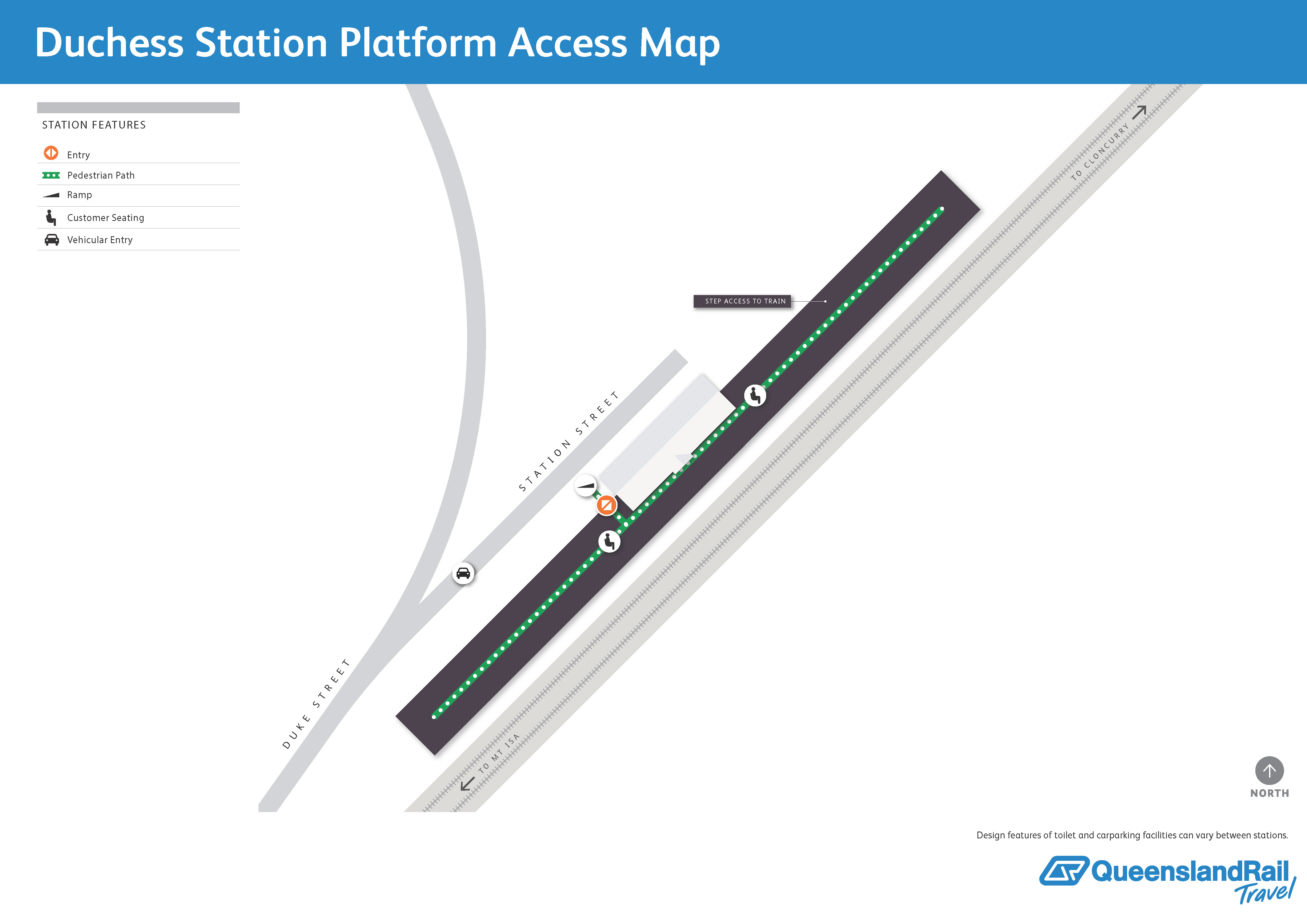 Duchess railway station is accessed via Duke Street and Station Street. It services passenger trains travelling between Townsville and Mount Isa. There is one platform, which is on the northern side of the track. There is no designated carparking. Access to the platform is via a ramp or steps. There is customer seating and shelter.