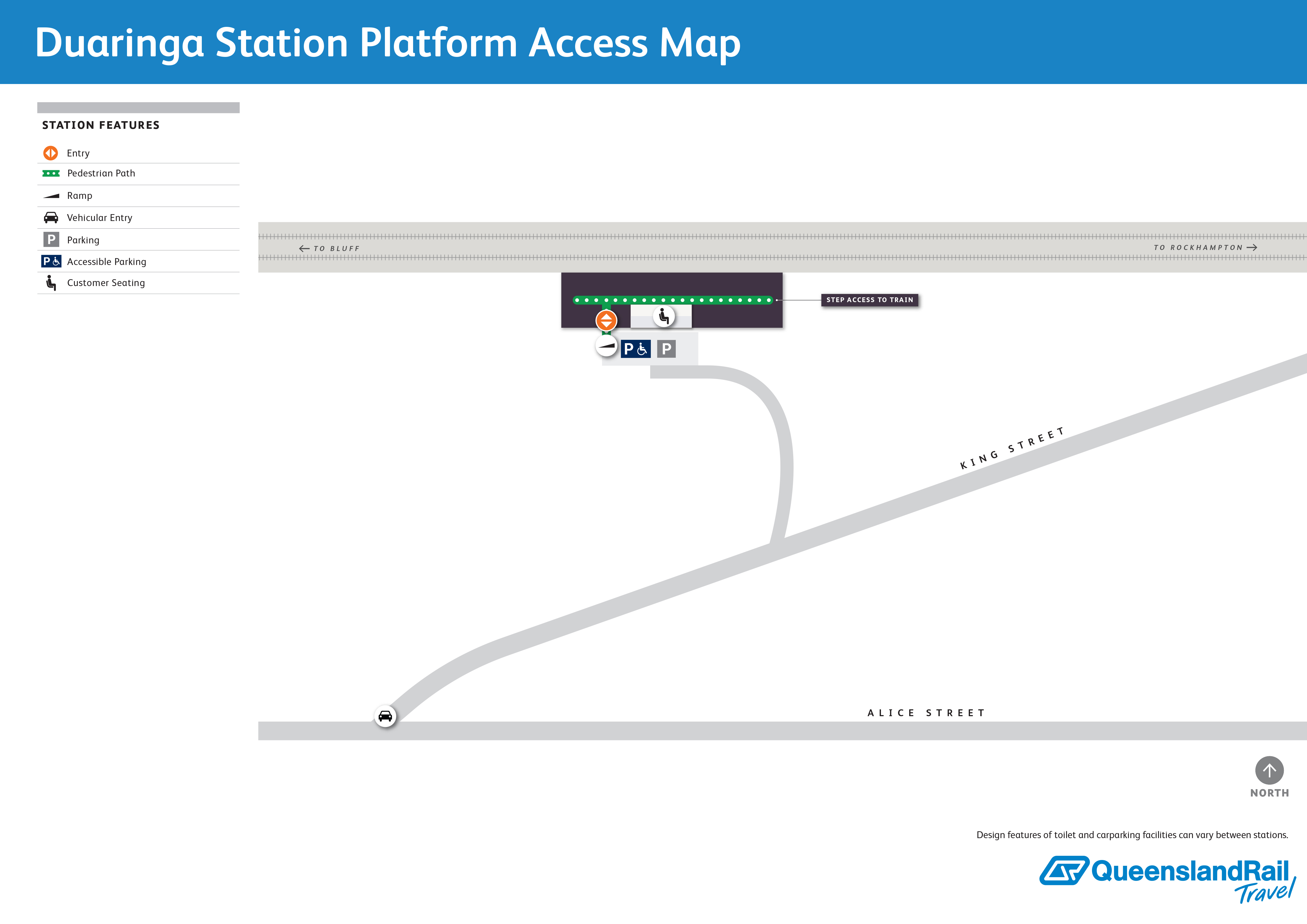 Duaringa station can be accessed via Alice Street and King Street and is located at the end of a dirt road. It services passenger trains travelling westbound to Longreach, and eastbound to Rockhampton then down to Brisbane. There is one platform, which is on the southern side of the track. There is carparking available, including an accessible space. Access to the platform is via a ramp.