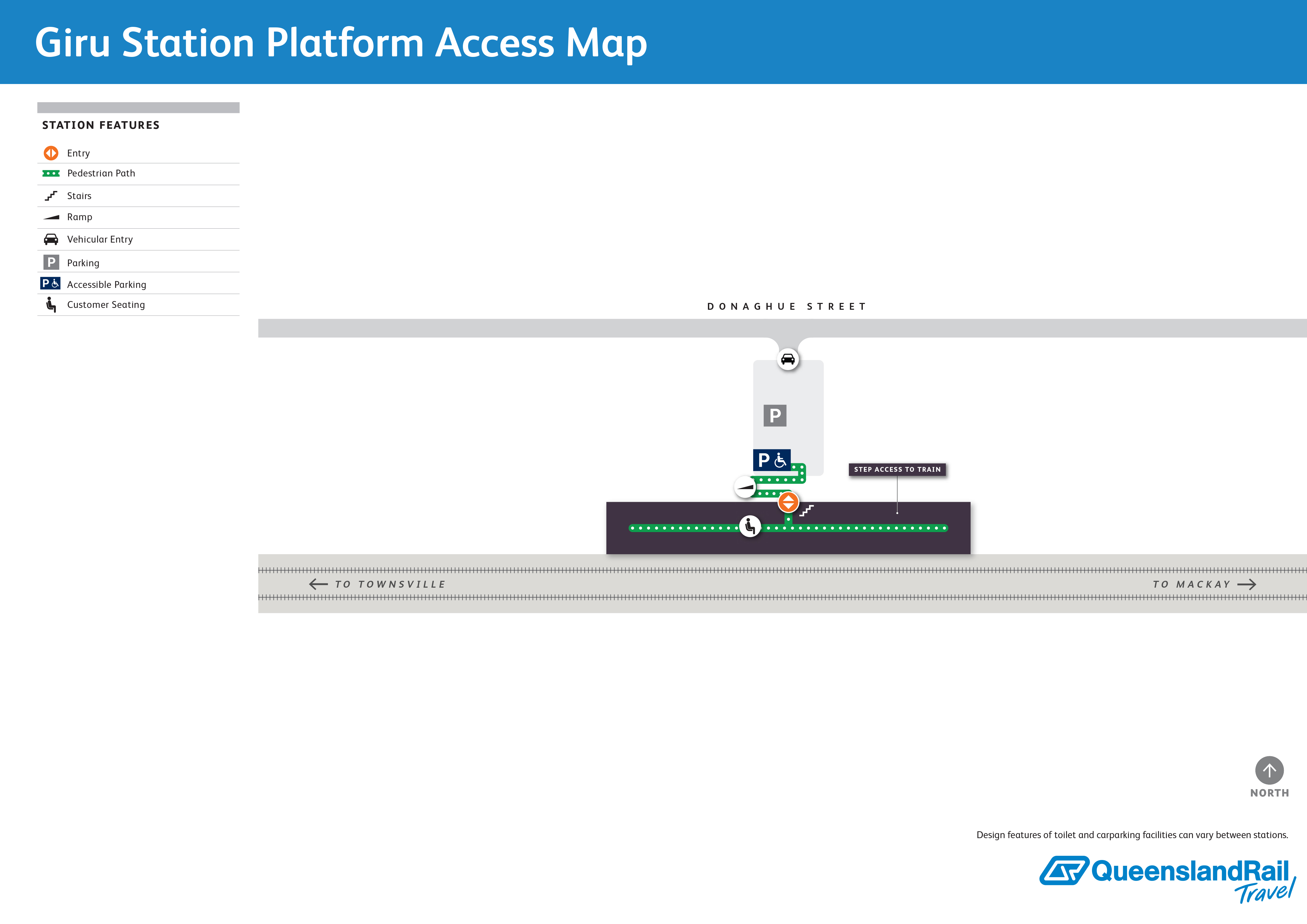 Giru railway station is located on Donaghue Street. It services passenger trains travelling northbound to Cairns and southbound to Brisbane. There is one platform, which is on the eastern side of the track. There is a car park in front of the station, which has accessible space. Access to the platform is via a ramp or steps.