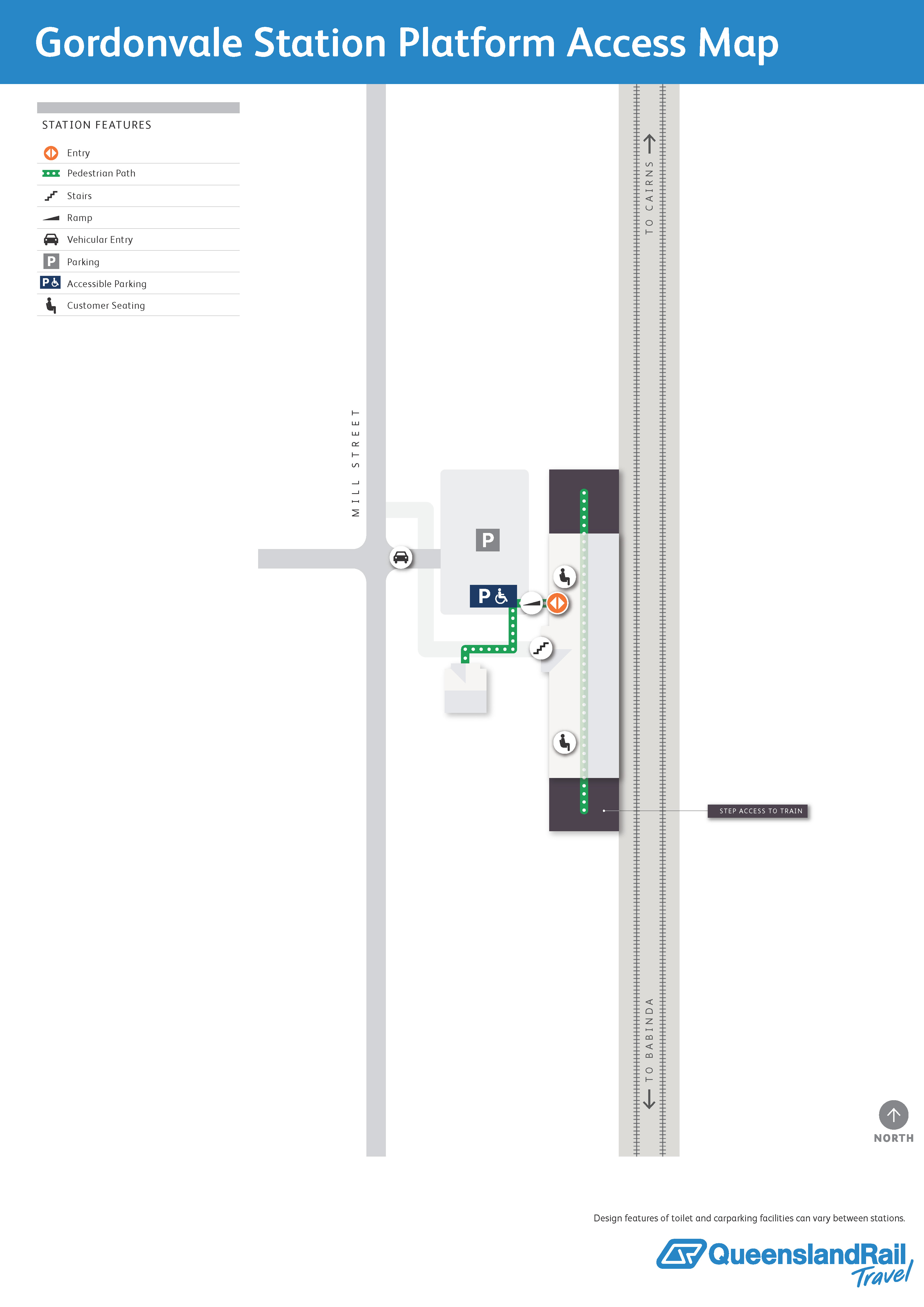 Gordonvale railway station is located on Mill Street. It services passenger trains travelling northbound to Cairns and southbound to Brisbane. There is one platform, which is on the western side of the track. There is a carpark next to the station, including accessible space. Access to the platform is via a ramp or steps.