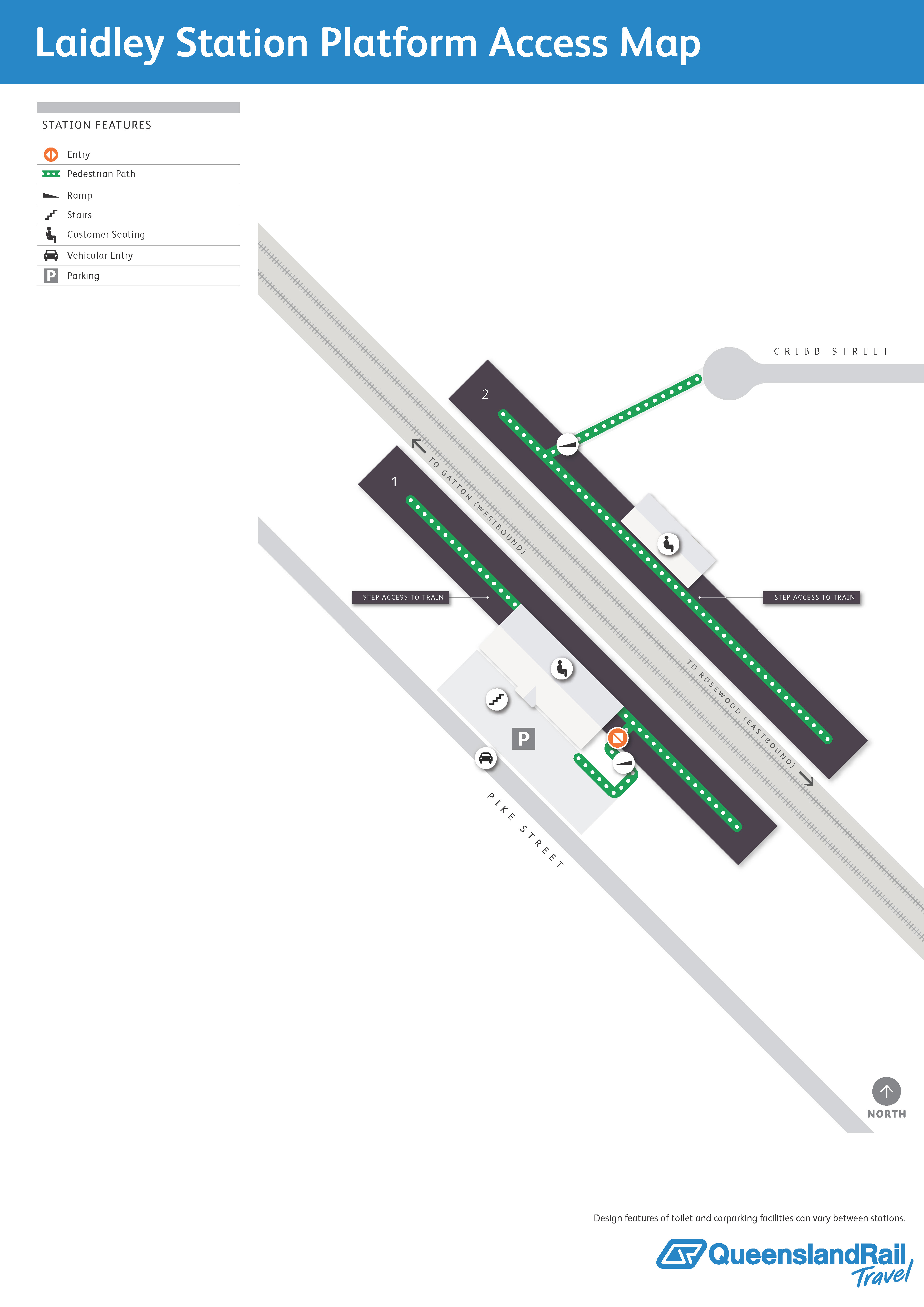 Platform 1 can be accessed from the Pike Street side and is for trains travelling west. Platform 2 is on the Cribb Street side and is for trains travelling east. There is no overpass joining the platforms, access is at street level.