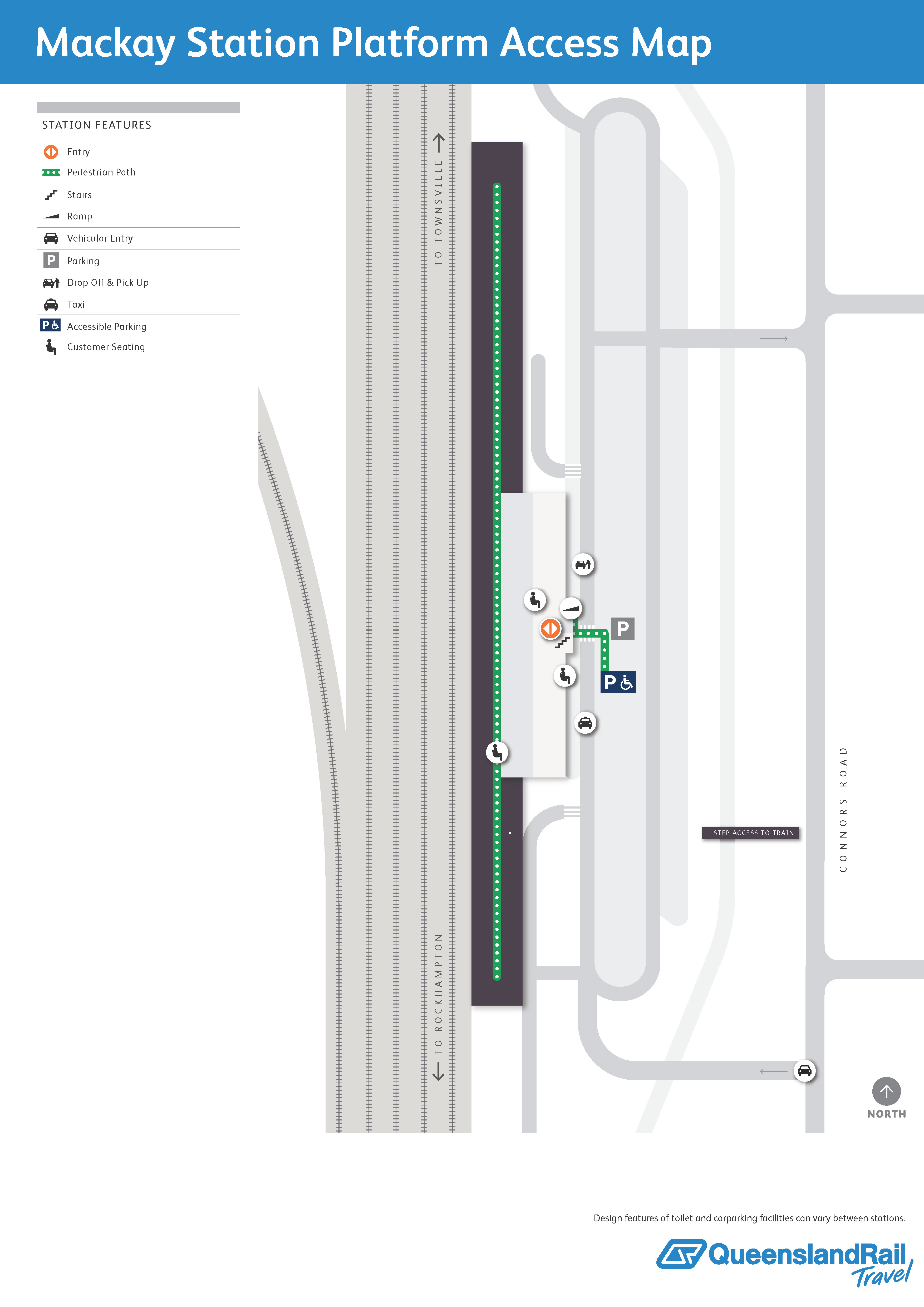 Access to the platform is via a ramp at either the southern or northern end of the station. Customers booked to join a service at Mackay will receive a pin code and can access the platform through the customer lounge, see below for more information.