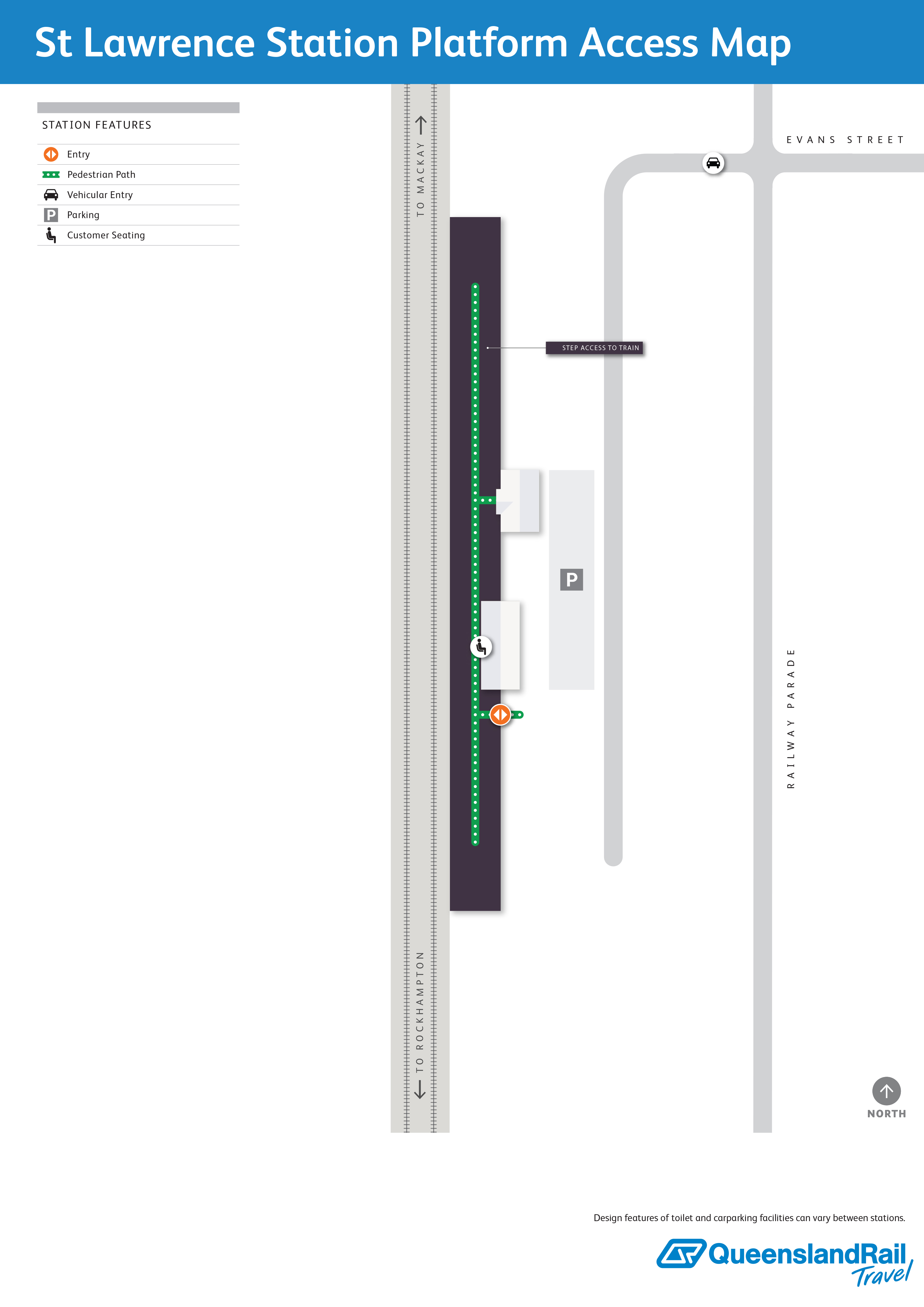 St Lawrence railway station is located off Evans Street via Railway Parade. It services passenger trains travelling northbound to Cairns and southbound to Brisbane. There is one platform, which is on the eastern side of the track. There is carparking available outside the station. Access to the platform is via a ramp or steps.