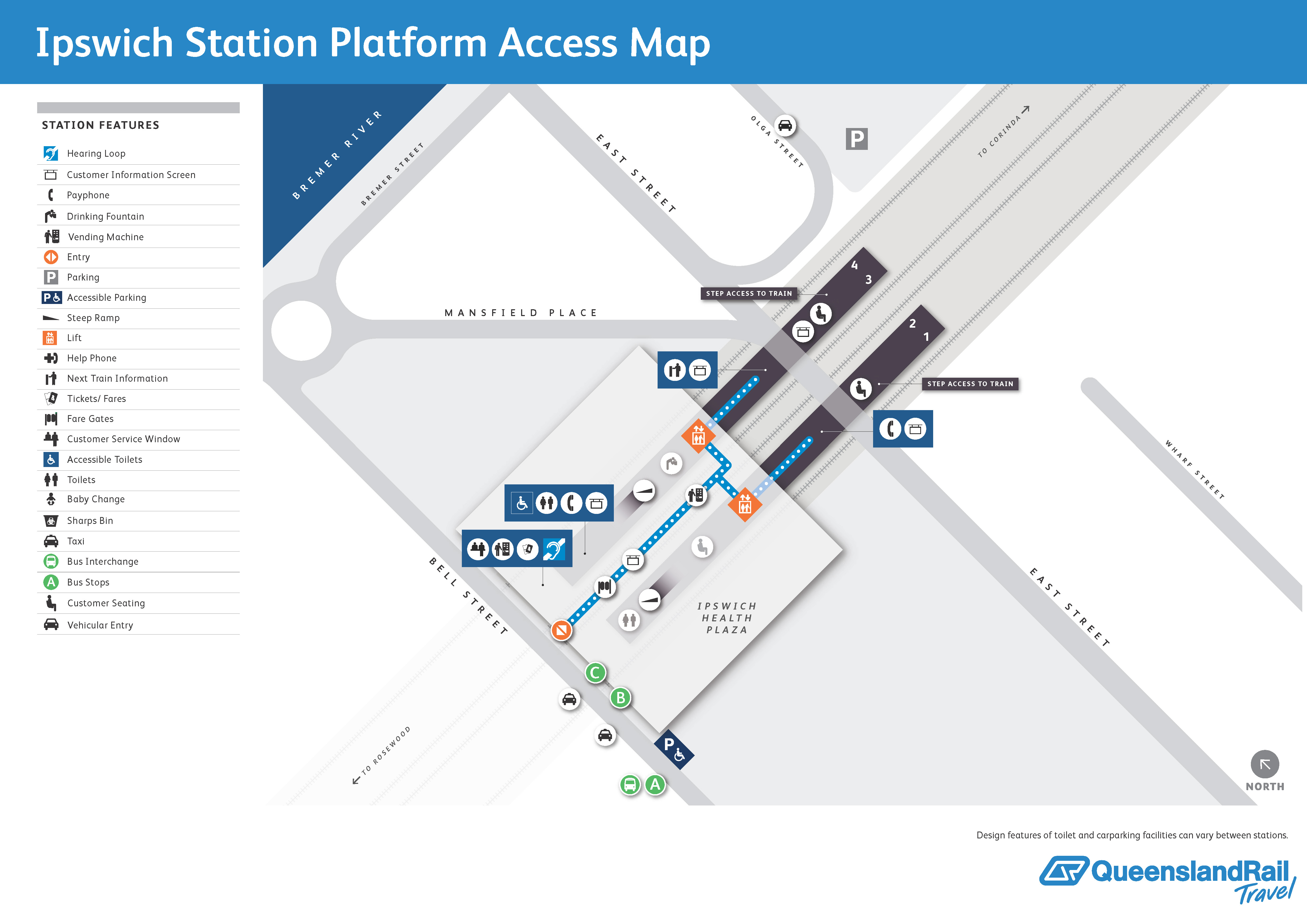 Ipswich railway station is located underneath the Ipswich Health Plaza, between Bell Street to the west and East Street in the east. It services trains travelling westbound to Charleville and back into Brisbane Roma Street station, as well as trains in the South East Queensland (SEQ) network. The station has four platforms across two island platforms, with tracks on each side. Platforms 1 and 2 are to the south and 3 and 4 are to the north. The station can be accessed via Bell Street, where lifts and ramps offer access to the platforms. There is a carpark, including accessible spaces off Bell Street. There is another carpark which is accessed from Olga Street.