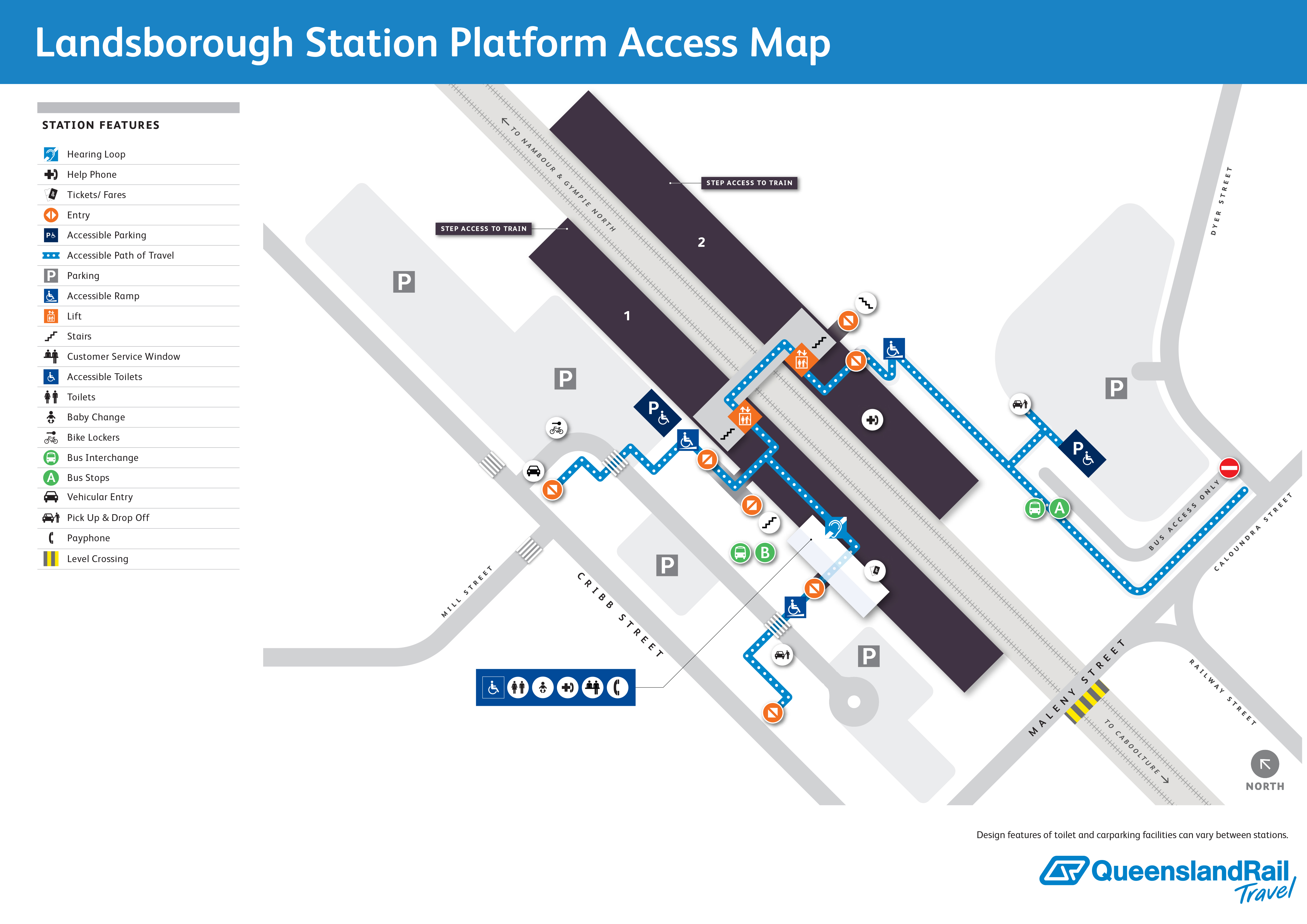 Landsborough railway station is located between Cribb Street on the western side and Maleny Street to the east. The station has two platforms that service trains travelling southbound to Brisbane and northbound to Bundaberg and Cairns, as well as trains on the South East Queensland (SEQ) network. Platform 1 is on the western side and Platform 2 is on the eastern side. There is carparking on both sides of the station, including accessible spaces. There are lifts available to access the platforms as well as stairs and ramps. An overpass bridge offers access to the platforms.
