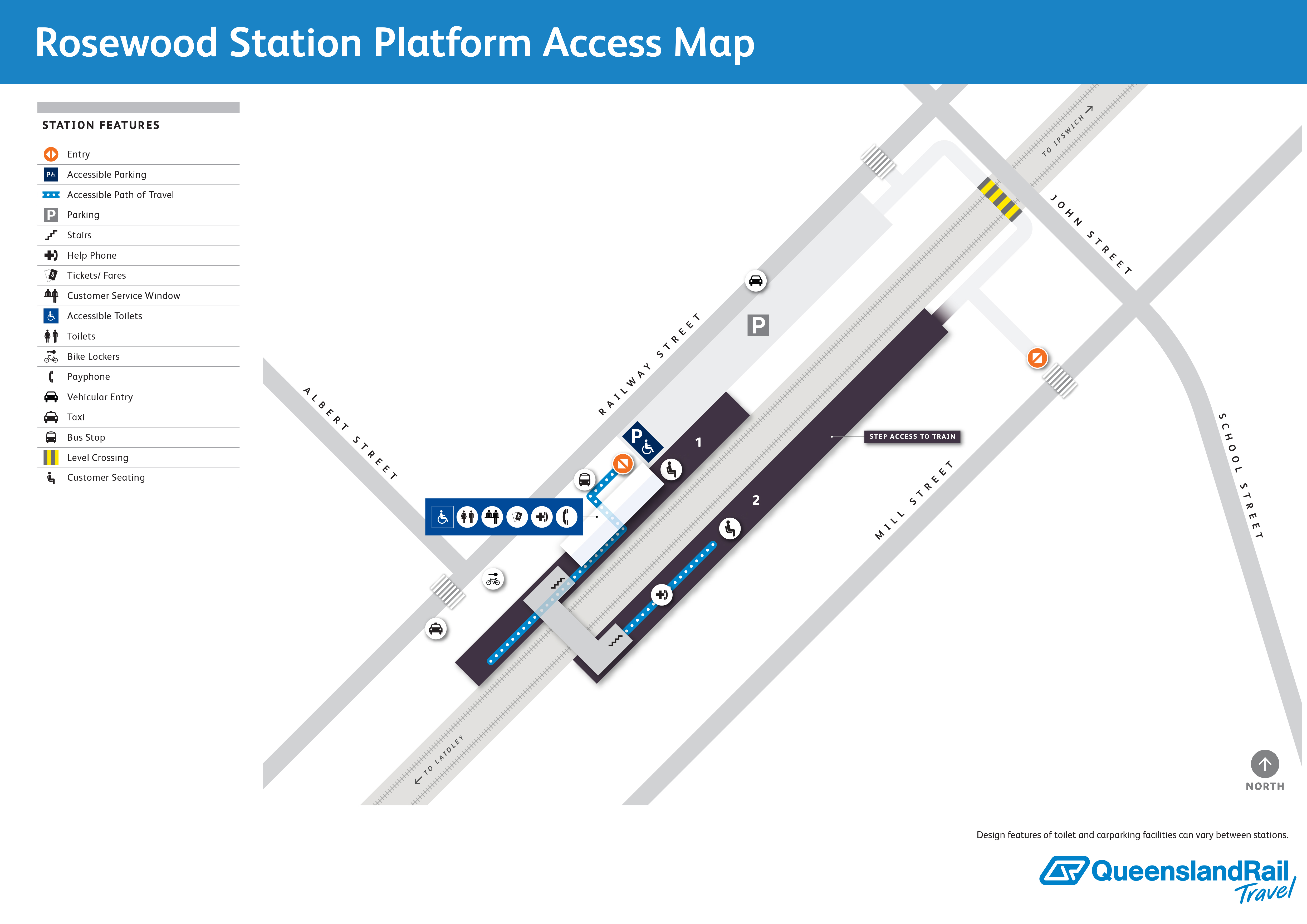 Rosewood railway station is located between Railway Street to the north and Mill Street to the south. It services trains travelling westbound to Charleville and back into Brisbane Roma Street station, as well as trains in the South East Queensland (SEQ) network. The station has two platforms, opposite each other, with two tracks running down the middle. Platform 1 is on the Railway Street side and Platform 2 is on the Mill Street side. The station can be accessed from Railway Street, where a car park, including accessible spaces, is available. ?There are stairs and an overpass bridge connecting the platforms. There are no lifts at Rosewood station.